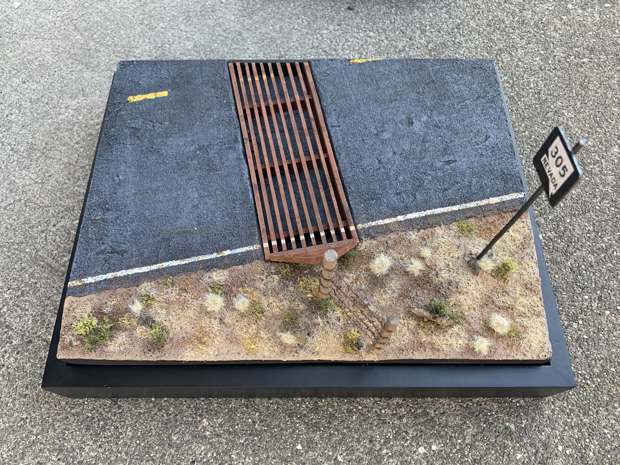 Cattle guard frame built and placed. Trimmed down foam for the earth slope away from the road.