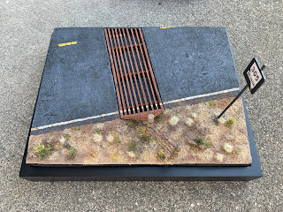 For the diorama, I picked up a cheap black picture frame to set the stage. Grabbed some pink foam and drew on the layout for the placement of things. It will be a portion of a paved road, the dirt edge, along with a cattle guard and road sign.