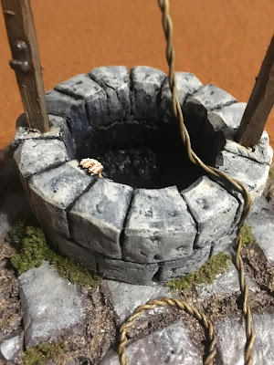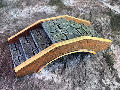 Here is the painting style I went for. Grey stone with highlighted edges. I used various thin washes of blue, green, brown and red over the stones. Grey is complimented by reddish brown wood and rusted metal bits. I added a bit of green/brown wash to the bottom of the platforms to simulate grime at the bottom. Should work well over water, as well as just dirty walls. Added a little bit of green flocking here and there to break up the grey and add some life.