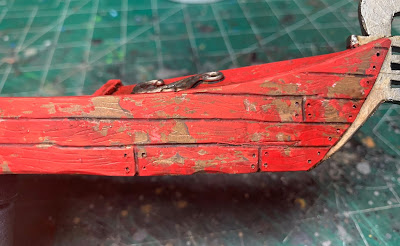 The side boards have a compound bend to them as they go from front to middle to back. I achieved it by applying heat to the plastic and bending. Once cooled, they retained their bends. Wood effect was made by scoring planks with a knife then widening with a pointy file. Wood grain applied by lightly scoring. Tiny drill holes create the nail marks at the ends of the wood planks.
